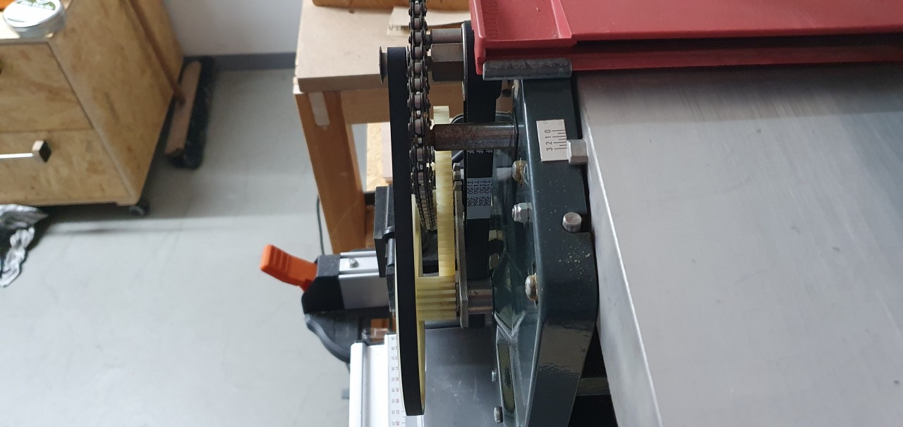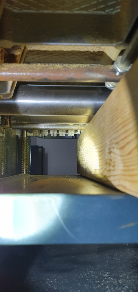 Nach dem Wechsel der Riemen musste ich die Welle mit dem Riemenrad für den Vorschub noch etwas richten. Diese war wohl mit der Zeit und der einseitigen Last etwas in Richtung Antriebswelle gebogen. Dadurch lief der Riemen Gefahr vom Riemenrad zu rutschen. Mit ein wenig sanfter Gewalt konnte die Welle wieder ausgerichtet werden und der Riemen läuft nun in der Mitte des Riemenrades.