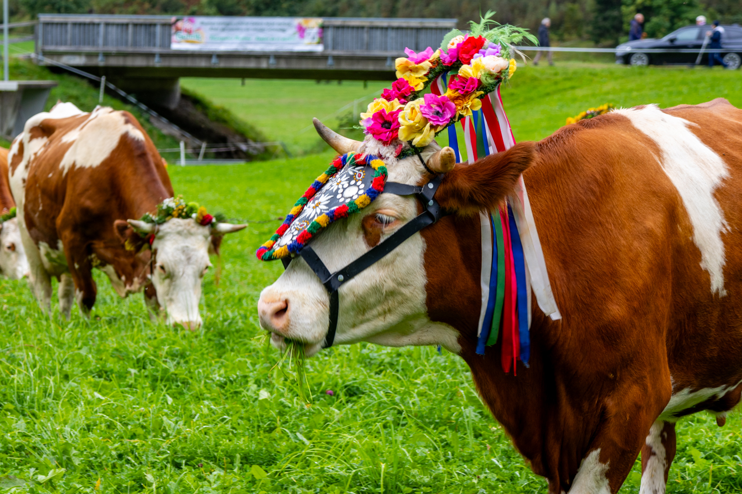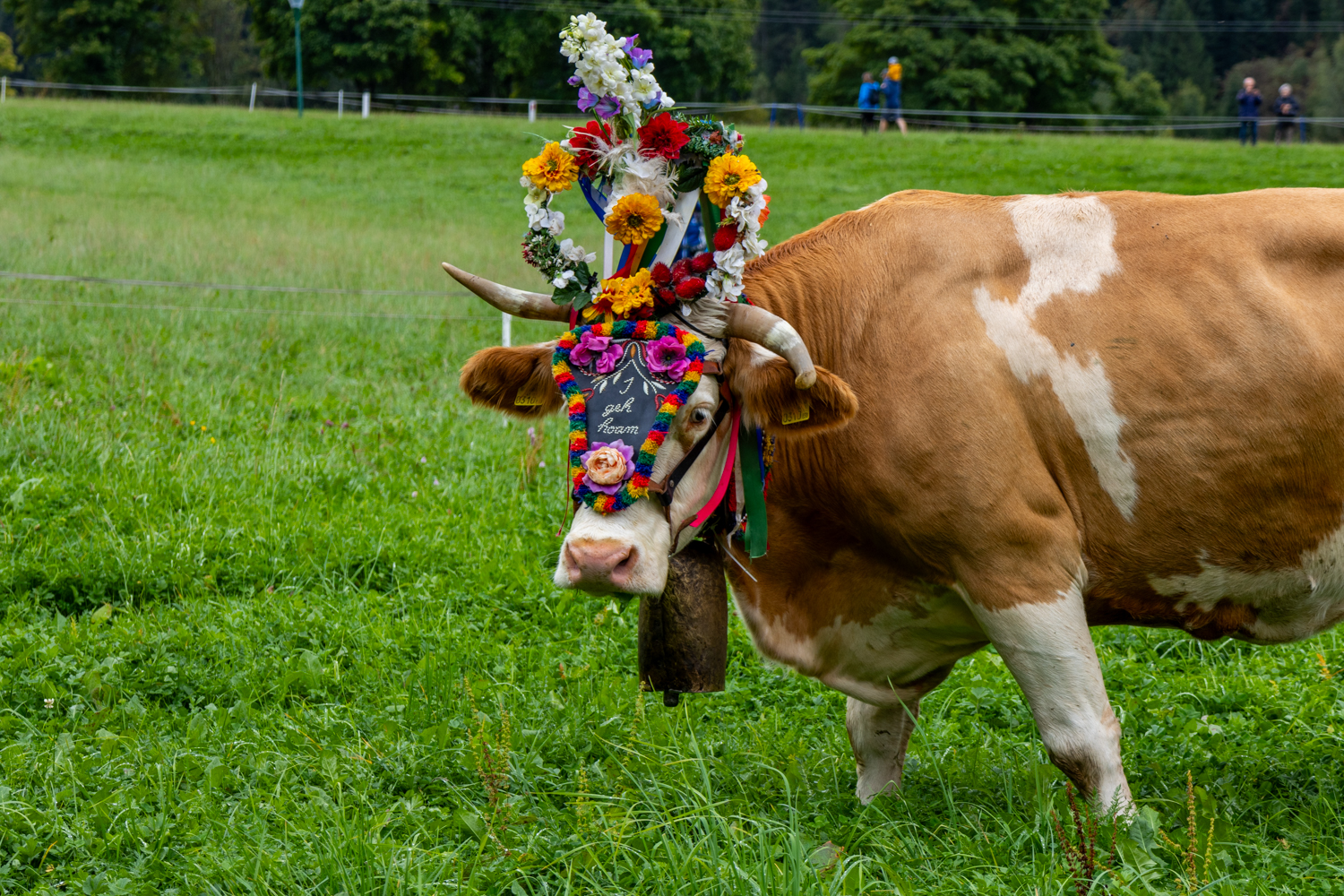 Wir sind wegen des nicht so guten Wetterlage ins Dorf gegangen und konnten am Empfang der Rinder auf der Wiesen im Dorf teilnahmen.